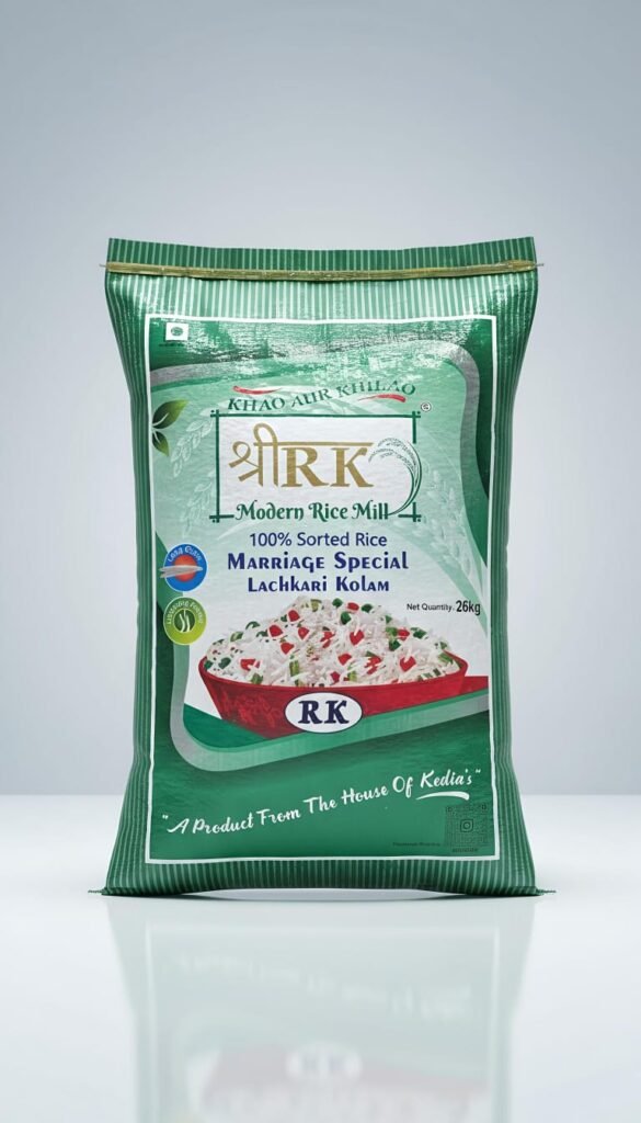 At SRI R K RICE, the paddy undergoes a carefully controlled steam-processing cycle, where it is cleaned, steamed, dried, and then milled. This process strengthens the grain from within, allowing it to cook evenly and absorb flavours better than raw varieties. Unlike parboiled rice, steam processing retains the rice’s natural taste while enhancing its aroma and shelf life. Each batch is graded, polished, and packed hygienically to ensure purity and long-lasting freshness. Sri R K Marriage Special Lachkari Kolam Rice is mostly preferred for marriages and events.